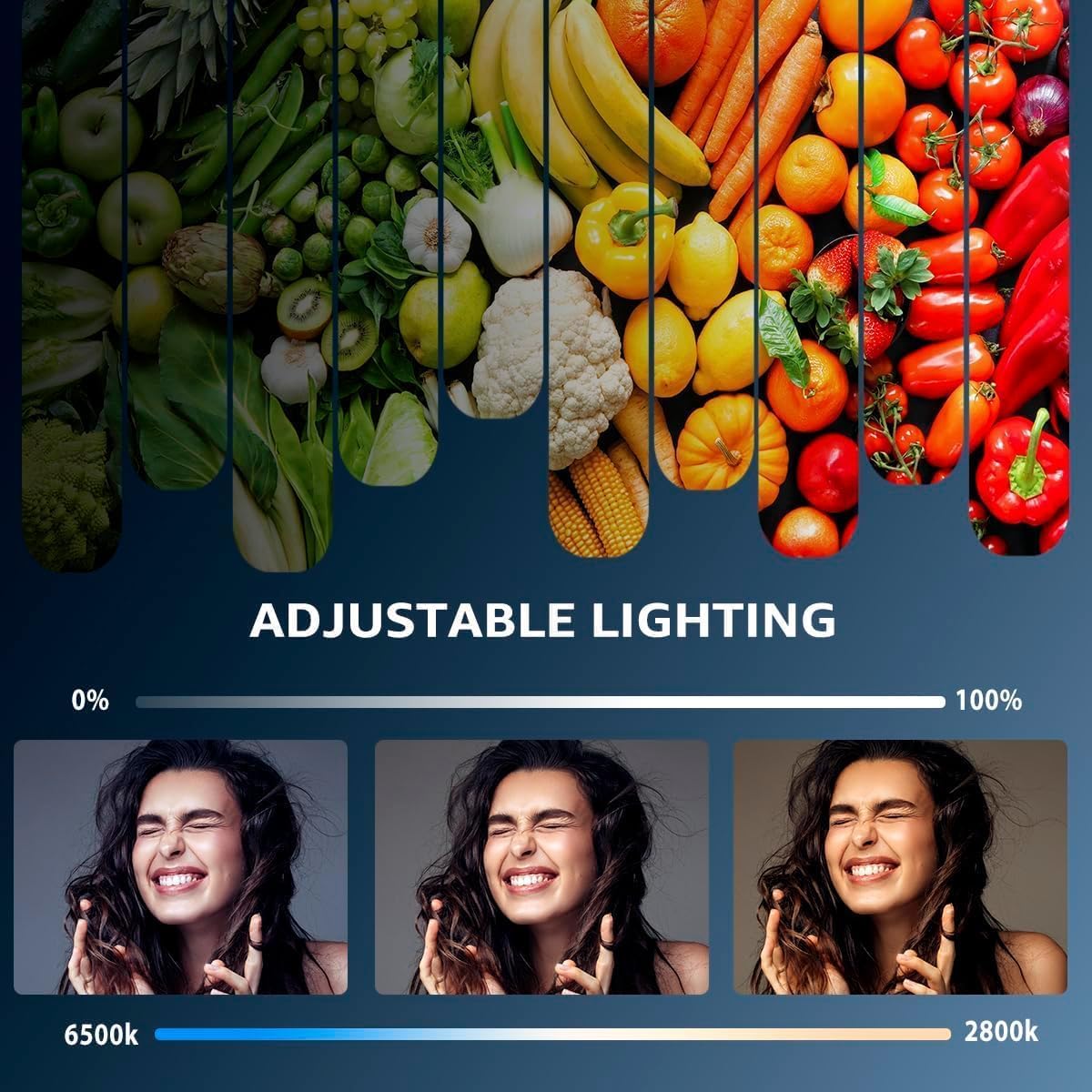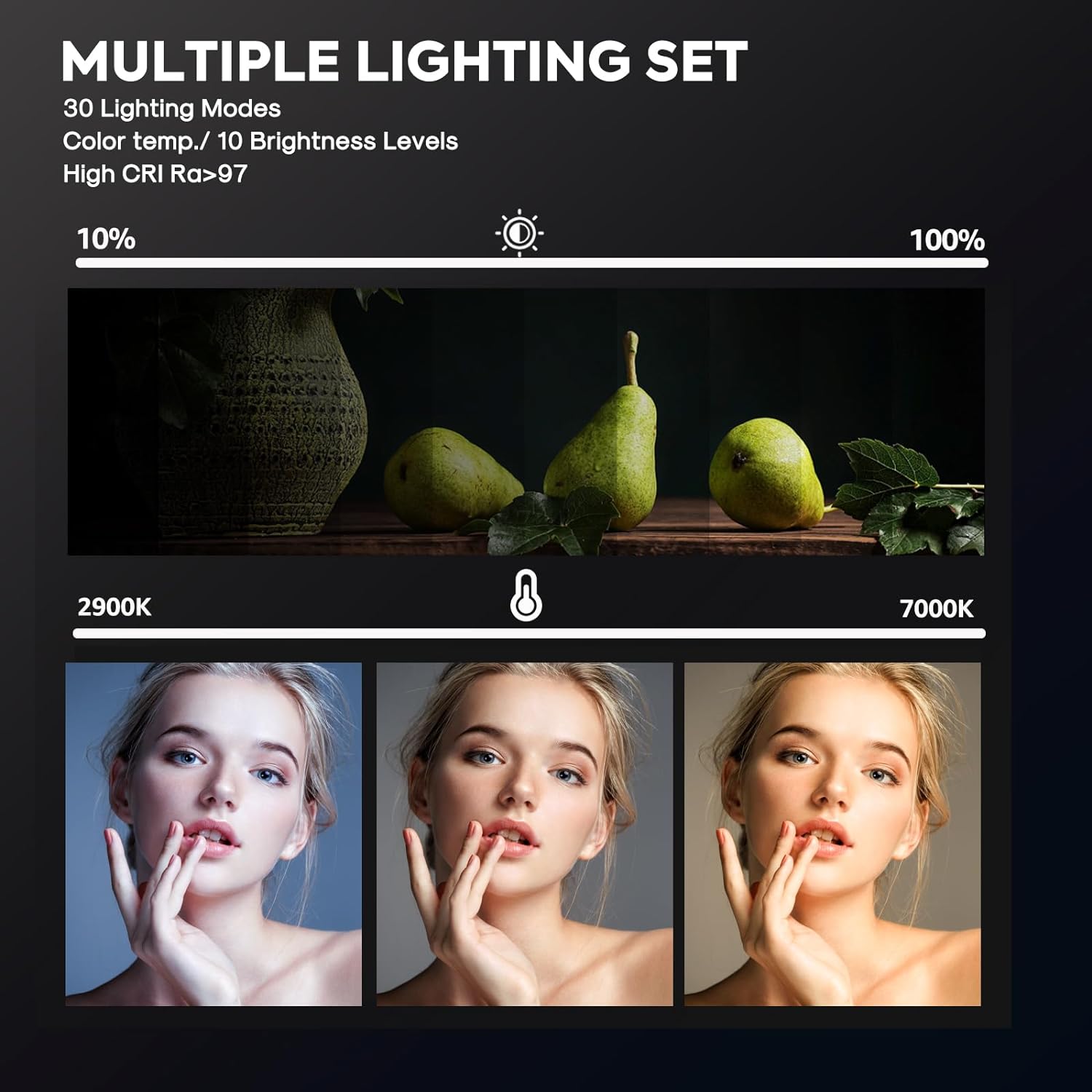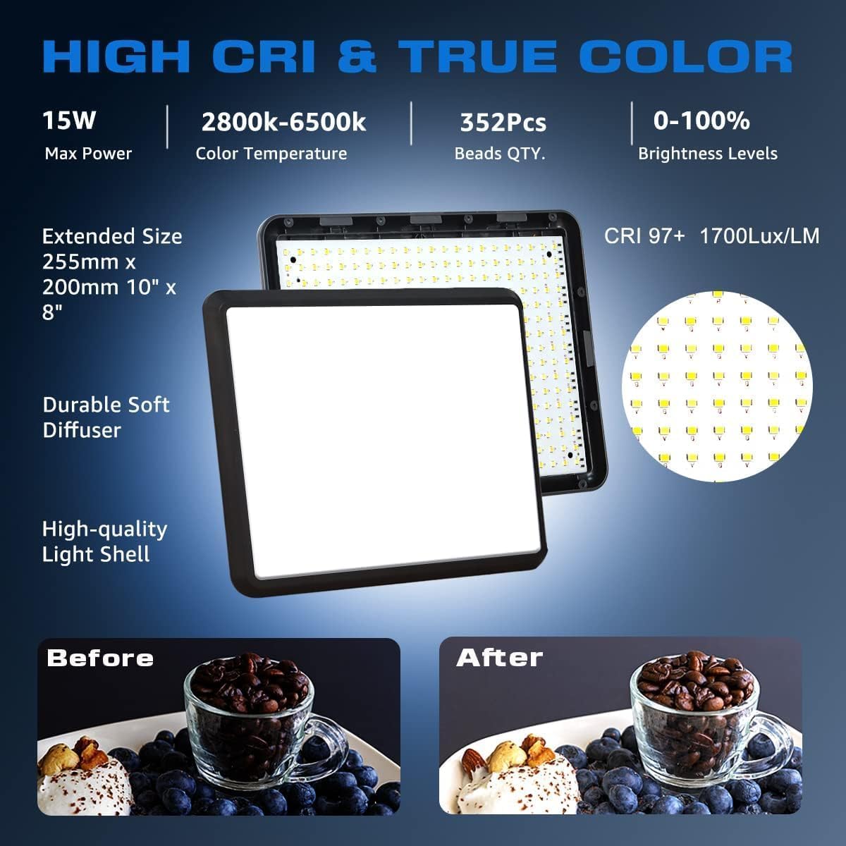- 【MULTIPLE COLOR TEMPERATURE & ADJUSTABLE BRIGHTNESS】Provide 3 Color temperatures (2900K, 4800K & 7000K)to create various lighting atmosphere; This Upgraded Studio Light which is equipped with 352 Led beads to make the light more ample and avoid unnecessary shadows. Features a high CRI of 97+ for precise color rendering. Adjust the brightness in a range of 10 to 100% with button up and down on remote to meet different photography circumstances, offering extra lighting for your works.