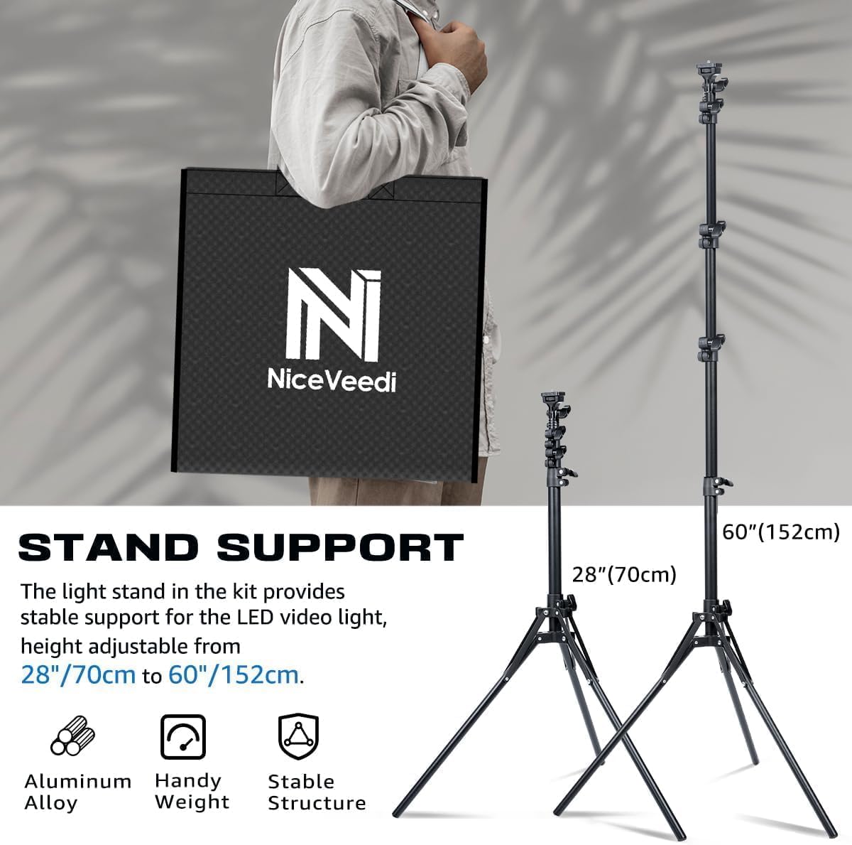- 【HEIGHT ADJUSTABLE TRIPOD】The tripod of the video light adopts durable but lightweight aluminum with powder sprayed layer, looks chic and classic. The light stand can be raised up to 61”. Folded size 17", perfect to store and carry. Adjust the height flexibly with 3 screw knobs loosen and tighten. Attach and detach the light panel easily with the 1/4" threads on the top of the tripod. Loosen the screw on side to rotate the light panel angle in range of 180°, tighten it when get suitable angle.