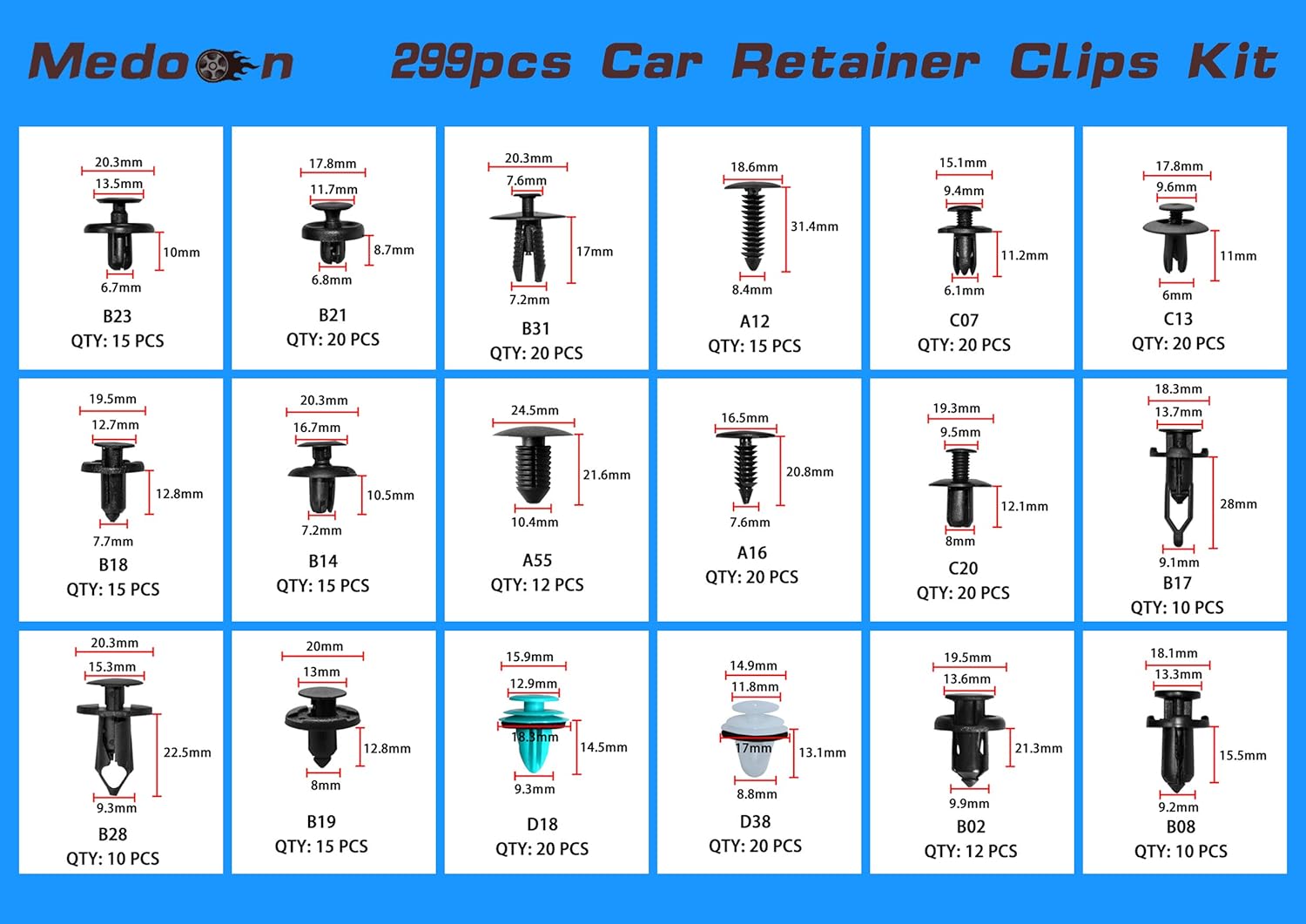- WIDELY USEFUL:The auto push clips are widely used for door panel, door trim clips, bumper clips,interior accessories and splash shield retainers replacement.All the necessary retainers for exact replacement of old and broken retainer.