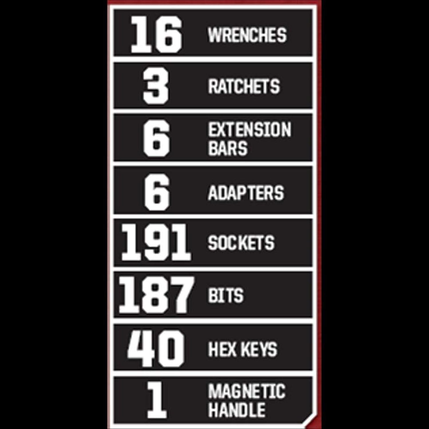 - 191 sockets, 6-point, 8-point and 12-point, in both inch and metric